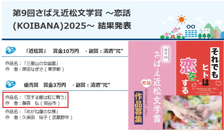 受賞作は、鯖江市のホームページ「第9回さばえ近松文学賞~恋話2025~結果発表」に掲載されています。