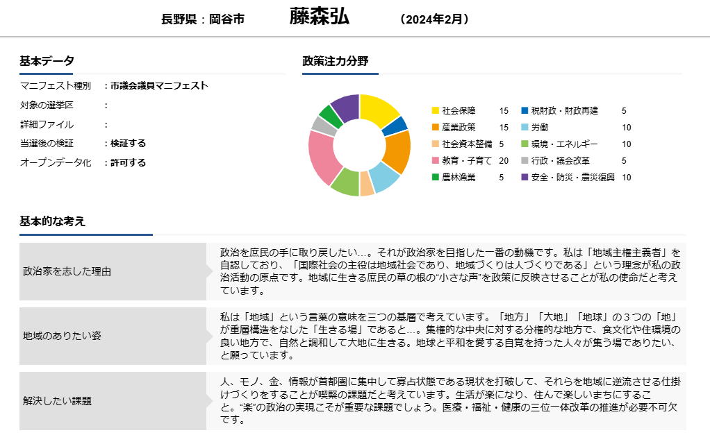 | 2023年 | 令和5年 | 定数割れとなった岡谷市議選にエントリーして無投票当選。会派:おかや未来研究室に所属。産業建設委員会副委員長、議会改革委員会ICT推進部会副部会長に就任。東堀区参与。 |